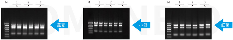 以上參考圖分別取50mg燕麥葉片,20mg小鼠肝臟和1ml細菌DH5α菌液各數份,組織進行液氮研磨處理,菌液離心收集細胞后,分別加入1ml Zomanbio RNApure 和 T、I公司相應產品,按各自說明書進行RNA提取。洗脫體積分別為80μl、100μl、60μl。RNA電泳上樣量分別為5μl,1%瓊脂糖凝膠電泳。