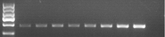 注:收集一定數量的293T細胞,使用本試劑盒提取總RNA,  10μl洗脫,取3μl進行RT-PCR實驗。上圖即為RT-PCR電泳結果,可以看到,細胞數量在1*102-8*102范圍內,均有PCR條帶,且條帶亮度成梯度增加。