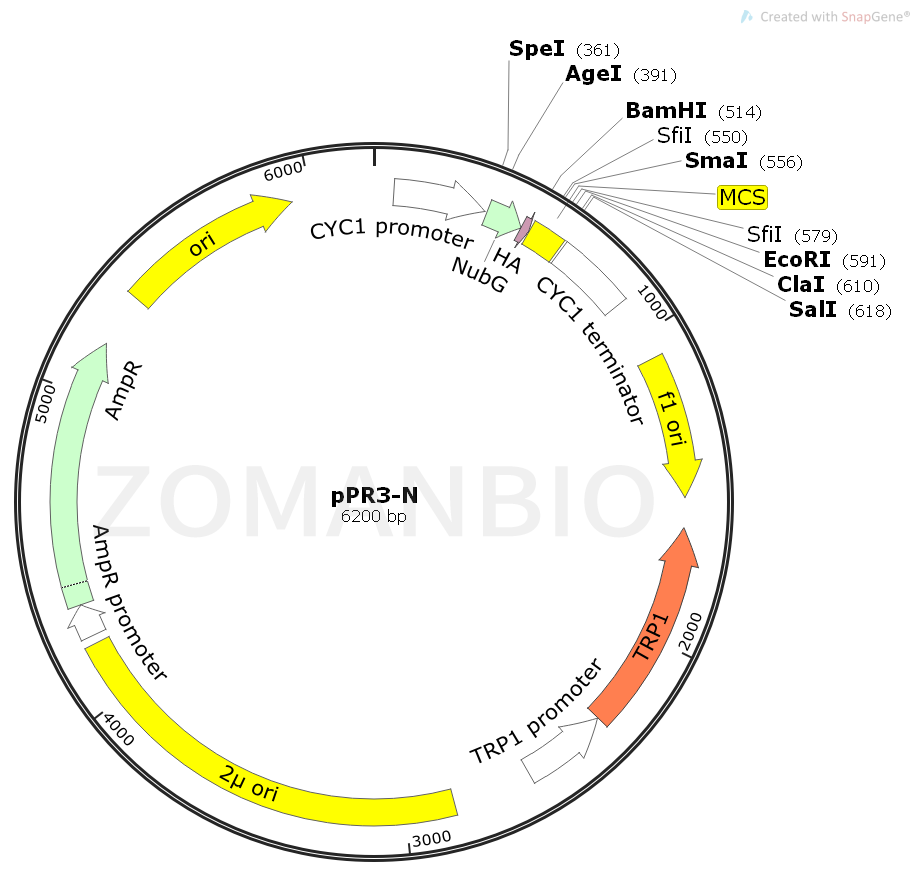 pPR3-N是一個用于膜蛋白酵母雙雜交實驗的質粒。The DUALmembrane system is intended for the detection and identification of interactions involving integral membrane proteins and membrane-associated proteins in yeast. The DUALmembrane pairwise interaction kit enables you to: