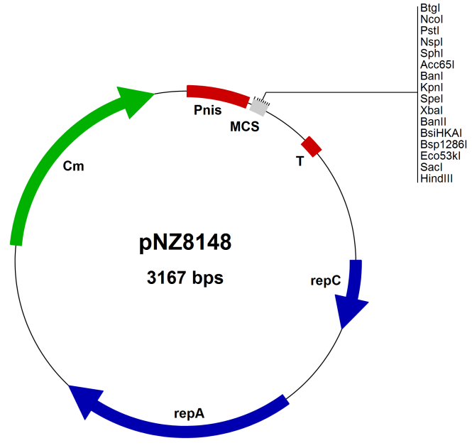 The pNZ8148 vector contains an origin of replication (ORI), the gene for the resistance to chloramphenicol, two genes for the replication proteins repA and repC, the nisin-inducible promoter (P nisA), and the transcription terminator (T). The gene, tagged with a Strep-tag II (STREP) followed by a stop codon (*), can be inserted between the necessary NcoI site and another endonuclease site from the multicloning site (MCS) such as PstI, SphI, KpnI, SpeI, XbaI, SacI and HindIII. The replicons of the vectors pNZ8008, pNZ8148, pNZ8149 and pNZ8150 are identical and came originally from the Lactococcus lactis plasmid pSH71. However, this replicon has a broad host range. Plasmids with this replicon can replicate in many Gram-positive bacteria, such as Lactobacillus plantarum and Streptococcus thermophilus. pNZ8148 – In this vector the nisA promoter is followed by an NcoI site for translational fusions at the ATG. It contains a terminator after the MCS. Sequence adaptation for cloning in NcoI can result in a change in the second amino acid of a protein (Mierau and Kleerebezem, 2005).