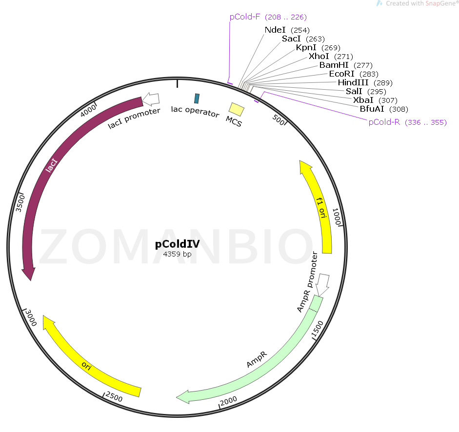 pCold IV質粒是利用冷休克基因CSPA啟動子設計高效率蛋白質表達載體。在啟動子下游處,插入了lac操縱子,以便嚴格控制表達。此外,5’非翻譯區(5’UTR),翻譯增強元件(TEE),His標簽序列,Xa因子切割位點和多克隆位點(MCS)位于CAPS啟動子的下游。當培養溫度切換到低溫時,大腸桿菌暫時停止生長,大部分的大腸桿菌蛋白質表達減少,但是一類稱為冷休克蛋白的蛋白質被特異性誘導表達。