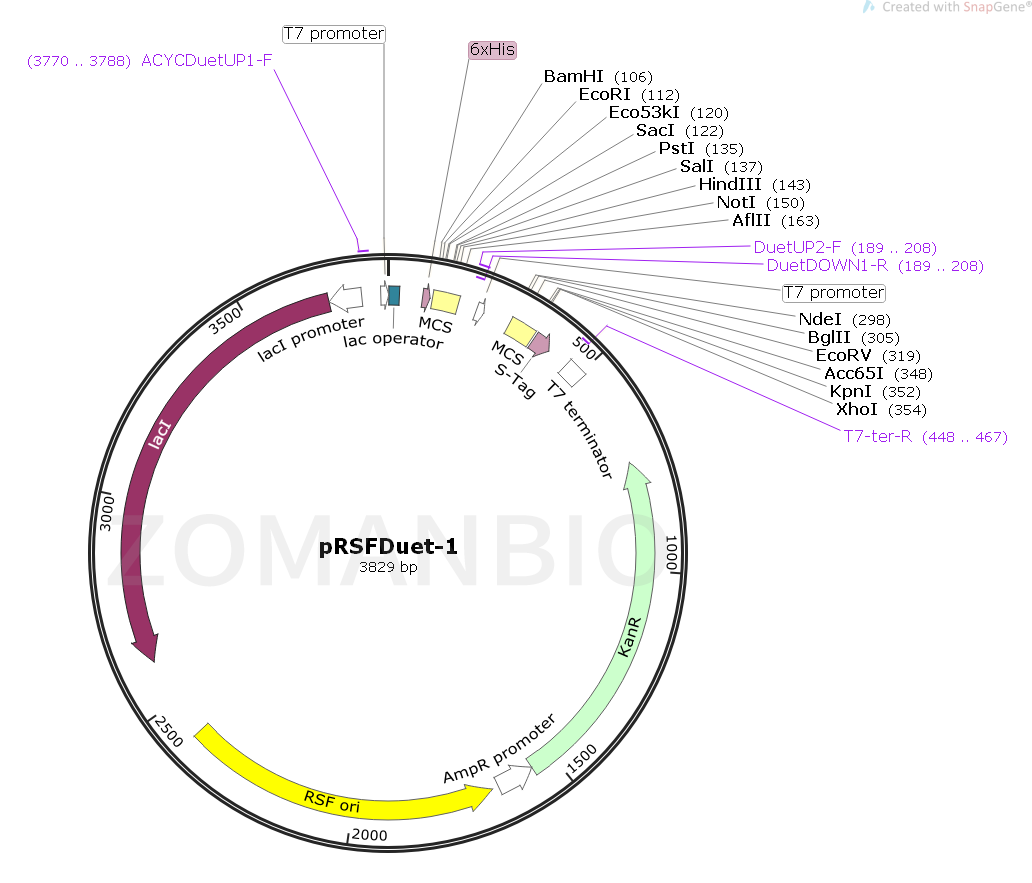 pRSFDuet-1質粒是一種原核表達載體, N端含有一個6×His標簽,C端含有一個S標簽。該質粒含有多個常用的酶切位點,便于不同基因克隆。表達由宿主細胞提供的T7 RNA聚合酶誘導,目的基因被克隆到質粒載體上,受噬菌體強轉錄及翻譯信號控制。