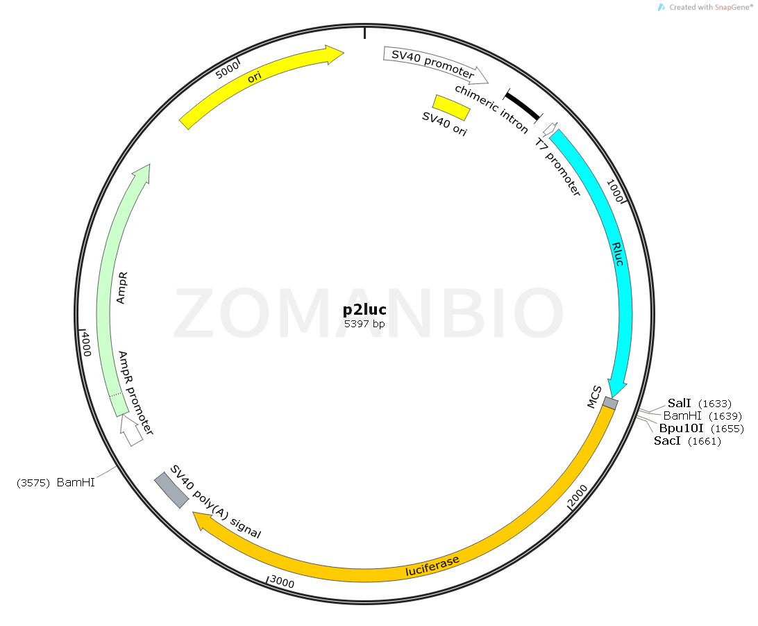 p2Luc是一個哺乳細胞雙熒光素酶報告質粒。