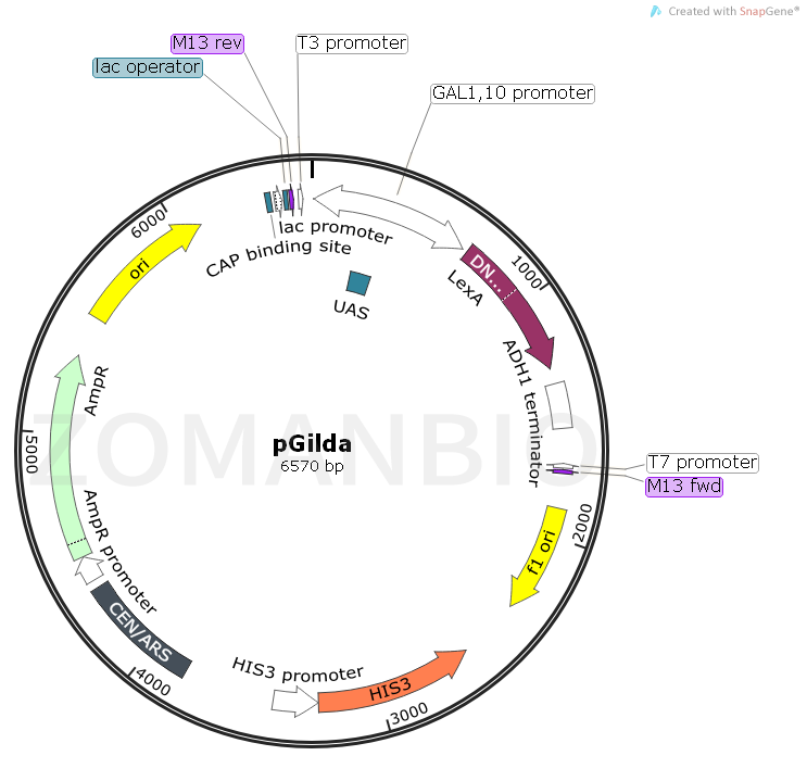 pGilda  is a cloning vector used to generate fusions of a bait protein with the 202-residue LexA protein, which acts as a DNA-binding domain in the MATCHMAKER LexA Two-Hybrid System . The hybrid protein is expressed in yeast cells from the tightly regulated GAL1 promoter (PGAL1); transcription is repressed in the presence of glucose and induced in the the absence of glucose and presence of galactose . pGilda carries the HIS3 gene for selection in His– auxotrophic yeast strains and is compatible with MATCHMAKER LexA Libraries. This vector replicates autonomously in both E. coli (using the Col E1 ori) and in S. cerevisiae (using the CEN/ARS ori). Ampr is used for selection in E. coli.
